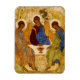 Icono/obra de arte de la antigua Andrei Rublev que representa al Padre, Hijo y Espíritu Santo sentados en una mesa. Las imágenes parecen tener alas de ángel.
