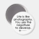 Este diseño gráfico elegante y divertido con la frase "La vida es como la fotografía. Se usan los negativos para el desarrollo" es perfecto para el fotógrafo que busca algo único para su armario.