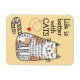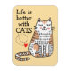 Un gracioso garabato de un gato sentado con los ojos cerrados, mejillas rosadas y parches de bronceado. A su izquierda están las palabras que la vida es mejor con los gatos con un divertido tipo de letra negra. Un pequeño corazón de amor rojo está zumbando desde la letra C y el fondo es de color beige.