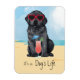 ¡Es la vida de un perro! Estar fresco y celebrar los días de perro del verano con este lindo Labrador Negro que lleva gafas de sol y se relaja con una bebida.