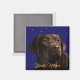 ¡A cualquiera que haya perdido el corazón con un perro de Labrador Recuperador le encantará este imán refrigerador! Cuenta con un magnífico Labrador Retriever de color chocolate, mirando al cielo azul de la noche lleno de estrellas doradas. En la parte inferior hay un texto personalizado con un guión dorado que dice "Labrador Recuperador". Puede personalizar el texto, o incluso eliminarlo si lo prefiere.
