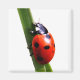 Un lindo pajarito con la foto de una linda mariquita con manchas rojas trepando una hoja de hierba verde sobre un fondo blanco. Perfecto para una dama que colecciona bichos.