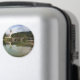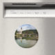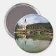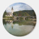 Imán fotográfico redondo con paisaje del lago Bohinj con agua tranquila y reflejo de la iglesia bautista de San Juan y el puente de piedra en Ribcev Laz, Eslovenia, a comienzos de la temporada de otoño.