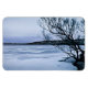Este imán flexible presenta una descripción impresionista de un paisaje pintoresco de invierno del lago Cayuga congelado, visto desde el Parque Stewart en Ithaca, Nueva York. Es uno de los cinco lagos de Finger en el norte del estado de Nueva York. El frío frío grisáceo de febrero se ve ilustrado por los encantadores tonos azules, grises, negros y blancos del hielo y el cielo. Las ramas de árboles silvestres en silueta enmarcan el primer plano.