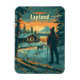 Una serena y nostálgica representación de Laponia, Finlandia, mostrando su prístina selva ártica, paisajes nevados y un patrimonio cultural único. El diseño presenta los renos emblemáticos de la región, las luces del norte bailando en el cielo nocturno y las acogedoras cabañas de madera rodeadas de bosques cubiertos de nieve, todo ilustrado con un estilo vintage. Esta obra de arte captura la serena belleza y el espíritu aventurero de Laponia, invitando a los espectadores a experimentar su mágica atmósfera y maravillas árticas.