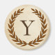 Una delicada corona de laurel está recubierta por un fondo de papel pergamino de estilo romano clásico. Este diseño se personaliza con el monograma "Y" en un rico tono de siena.