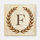 Una delicada corona de laurel está recubierta por un fondo de papel pergamino de estilo romano clásico. Este diseño se personaliza con el monograma "F" en un rico tono de siena.