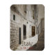 Imán fotográfico vertical de la lavandería que consiste en mantas blancas que cuelgan para secarse al sol en la fachada de una casa de piedra blanca en una callejuela con escaleras de piedra arenisca en una ciudad de Italia, creando una típica vista de la calle italiana/mediterránea con el título "Italia, la vita è bella", lo que significa que la vida es hermosa en Italia.
