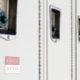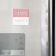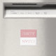 Un imán de lavavajillas simple, minimalista, de color rosa y blanco sucio/limpio.