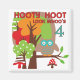 Búho camisetas de cumpleaños 4, trajes para el cuerpo, tazas, imanes, agujeros, posters, bolsas, y más con un búho, muchos árboles, y texto que dice "¡Hooty Hoot Look Whoo's 4!"