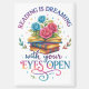 Diseño vibrante y colorido con un dragón con pila de libros, el primero abierto con rosas azules y rosas rosas. El colorido texto dice: "Leer es soñar con tus ojos abiertos". Este diseño está disponible en una amplia variedad de productos.