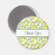 Un imán de agradecimiento con agradecimiento escrito dentro de una pancarta blanca con un borde verde. El fondo está diseñado con limones amarillos y hojas verdes, en un patrón de repetición.