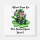 Un leprechaun irlandés sentado en un trébol de champú. Se pregunta '¿A qué hora empiezan los travesuras? ¡Genial para el Día de San Patricio!