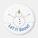 Este imán presenta a un muñeco de nieve feliz con la nariz de zanahoria naranja y brazos extendidos mirando hacia arriba la nevada con el texto curvo azul que dice "¡Que nieve!"