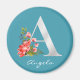 Exquisita decoración floral con un bonito peón en tonos rojos, con pequeños brotes de flores en el mismo tono. El acondicionamiento tiene una forma caprichosa y está decorado con bayas violetas y hojas verdes brillantes. El nombre personalizado de la parte inferior une el diseño y lo hace único. Esto haría un regalo fabuloso para cualquier chica cuyo nombre comience con la letra A. Personalizable de fondo turquesa
