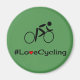 Este es un imán divertido para un ciclista entusiasta, o solamente para cualquiera que aprecie viajar en bicicleta. Representa un pictograma de un solo ciclista y el eslogan de la etiqueta #LoveCycling. El fondo es verde (para simpatizar con el exterior) y la "V" del amor se ha transformado en un corazón rojo.