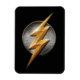 Este es el símbolo del rayo dorado de The Flash sobre un disco metálico de malla plateada de la película de la Liga de la Justicia.