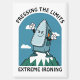 Un gracioso dibujo de una plancha personalizado con una cara determinada, brazos y piernas parados encima de una montaña verde con nieve blanca. Detrás de él hay nubes esponjosas blancas sobre un cielo azul. Arriba y debajo de la imagen se puede leer 'Presionando los límites' y 'Planchando extremo' en texto negro. Estas son las dos plantillas que puede utilizar como están o reemplazar por su propio texto si lo desea. O borrar las palabras para dejar en blanco.