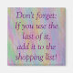 Este imán útil y colorido dice: "No olviden: Si usan el último, agréguenlo a la lista de compras