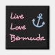 Muestra la frase "Live Love Bermuda" en un guión o estilo impreso a mano en texto rosa y un ancla azul de un barco. Un recuerdo para los residentes de las Bermudas, turistas, visitantes, marineros y barqueros. Bonito diseño tranquilo y feliz para recordarte de qué se trata la vida. Celebrar la alegría y la libertad de las islas Bermudas.
