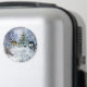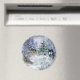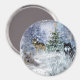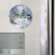 Este imán de nevera redonda cuenta con una hermosa escena de invierno con árboles cubiertos de nieve, lobos salvajes y un árbol de Navidad decorado.