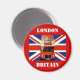 Fridge Magnet de recuerdo de Inglaterra/Londres con bandera británica y emblemático autobús rojo de dos pisos en Londres. El mismo diseño también está disponible como tarjetas de felicitación, postales, insignias, imanes, Pegatinas, camisetas, Gorras, aprones, llaveros.