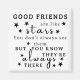 "Los buenos amigos son como las estrellas. No siempre los ves, pero sabes que siempre están ahí."Este diseño captura la esencia de una amistad duradera, usando la analogía de las estrellas para ilustrar la presencia inquebrantable de buenos amigos. Es un recordatorio de que los verdaderos amigos siempre están ahí, ofreciendo apoyo y comodidad incluso cuando la distancia o las circunstancias los mantienen separados. Esta cita resuena con cualquiera que aprecie el vínculo duradero con sus amigos más cercanos.