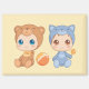 Bebés personalizados en enterizos animales. La de la izquierda está vestida con un traje de salto de oso marrón con una buna amarilla y una abeja minúscula. El de la derecha está vestido como un gato gris y sostiene a un bebé rattle en forma de campana de un gato. La bola brillante descansa entre ellos.