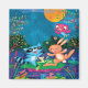 Artista: Elisa Chavarri | Racoon y conejito, rana y búho bailando en el estanque por la noche con una gran luna de otoño sobre ellos en el cielo