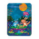Artista: Elisa Chavarri | Racoon y conejito, rana y búho bailando en el estanque por la noche con una gran luna de otoño sobre ellos en el cielo