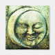 Sol sonriente y enmarcado por una luna creciente. Hecho en piedra con colores verdes, dorados, bronce y negro.