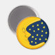Luna dormida amarilla brillante rodeada de muchas pequeñas estrellas amarillas en un cielo azul de medianoche.