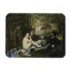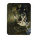 El almuerzo en el césped (Le Déjeuner sur l'Herbe) de Edouard Manet, óleo sobre lienzo 1863, es un cuadro paisajístico de cuatro personas que hacen picnic en un vaso boscoso rodeado de árboles oscuros y follaje. Los historiadores del arte a menudo citan la pintura como el punto de partida del arte moderno por sus formas aplanadas, su técnica de pintura y su temática moderna "chocante", y la imagen generó gran controversia en su primera presentación. Para las mujeres, Manet empleó a su famosa modelo Victorine Meurent y su esposa Suzanne, contrastándolas vívidamente con sus compañeros masculinos. La composición fue transpuesta a partir de un grabado renacentista de Marcantonio Raimondi diseñado por Rafael, lo que avivó la notoriedad de la pintura. Los duros contrastes de la técnica de pintura clara y oscura, y el realismo de hecho de la composición aplanada marca Luncheon en el jardín como una de las pinturas más importantes del siglo XIX, influyendo en muchas generaciones posteriores de artistas modernos. Edouard Manet (1832-1883) fue un pintor realista francés y uno de los fundadores del movimiento impresionista francés cuyas polémicas pinturas marcaron la fundación del arte moderno. Persiguiendo el arte a una edad temprana, Manet estudió durante 6 años bajo el pintor académico Thomas Couture y en viajes al extranjero se encontró con los maestros holandeses, así como con los pintores españoles Velázquez y Goya. Inaugurando su propio estudio en París, Manet produjo muchas pinturas bajo la influencia del Realismo de Courbet, pintando escenas de la vida moderna. Su obra maestra Luncheon en la Grasa y Olimpia de 1863 suscitó gran controversia, y aunque el artista siguió exhibiendo en el Salón oficial de París, se hizo amigo de Degas, Monet, Renoir y otros pintores impresionistas clave. Pintando de manera holgada y esquemática con pinceladas y formas aplanadas que algunos encontraron inacabadas, Manet produjo muchas escenas de bohemias de vida nocturna en cafés, escenas periodísticas de guerras y acontecimientos actuales, así como temas de las calles de París con tal espontaneidad e innovación de composición que hicieron una influencia duradera en las generaciones más jóvenes de artistas y lo consagraron como el verdadero "pintor" moderno vida". Aunque el artista murió joven, Manet creó pinturas que eran el lugar de reunión y el punto de referencia de la escuela del impresionismo y los fundadores de la pintura moderna.
