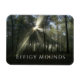 Fotografía de la luz solar matutina filtrando árboles cerca del punto de incendio en el Monumento Nacional de Effigy Mounds, Iowa.