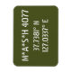 Coordenadas de mapas de latitud y longitud para el hospital de campo ficticio M*A*S*H* 4077, que según se informa estaba cerca de la ciudad de Uijeongbu, Corea del Sur. Tipo de letra blanca del estilo de la galería de símbolos en el fondo verde del ejército.