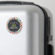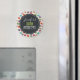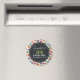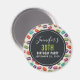Un imán de cumpleaños con un patrón adorable de macarons en muchos colores diferentes con un patrón de lunares tenue detrás. Tu información de cumpleaños personalizada escrita en blanco dentro de un círculo negro.