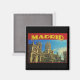 Esta maravillosa escena de estilo vintage presenta edificios en Madrid, España con el nombre de la ciudad al otro lado de la parte superior de amarillo sobre un fondo rojo.