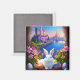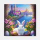 Digital art of an adorable white rabbit in a basket, surrounded by decorative colorful eggs, flowers and roses, creating a cheerful and festive atmosphere. In the background, a serene blue lake is framed by magical castles, gardens and flowery ornaments that transport the viewer to a fairytale world.