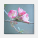 Fotografía de una rama de manzano con flores de manzana rosada en un fondo azul/gris.