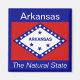 Una auténtica imagen de calidad fina de la bandera de Arkansas ambientada entre el nombre del estado y el apodo sobre un fondo de color de bandera clara.