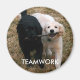 Pintura de un adorable cachorro negro de laboratorio y un cachorro de recuperación dorado en juego, cada uno con un extremo de un gran palo en la boca, corriendo juntos en pura joya, en un imán.
