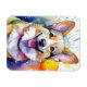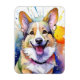 Una imagen de arte digital de un Corgi vibrante con orejas grandes y expresivas y una expresión feliz domina la imagen, rodeado de salpicaduras de coloridas acuarelas. El fondo está decorado con ráfagas dinámicas de azul, amarillo y naranja, que le dan un toque lúdico y enérgico.
