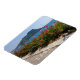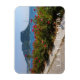 Una hermosa vista de la Roca de Garda y las flores coloridas del lago de Garda en Italia impresas en un imán de recuerdo para refrigeradores.
