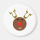 Este divertido imán de Navidades presenta a un personalizado de renos. Tiene ojos negros y una enorme nariz brillante roja brillante y brillante. Las cuerdas apuntan y parecen futuristas haciendo de este reno un reno cibernético. Sin embargo, sigue siendo lindo y amigable.