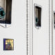 Una de las tres cosas es amarilla: mirando a través de una ventana a un jarrón de tulipanes, tres mujeres con vestidos coloridos y un arcoiris mudo sobre un fondo de cajas amarillas.