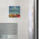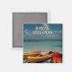 Este imán de recuerdo muestra una foto tomada en una playa en una isla de las Bahamas. Cielo azul y océano turquesa con kayaks de colores vivos en primer plano.