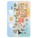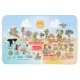 Una escena luminosa y colorida ofrece una vista espectacular del sur de California - personajes extravagantes de la playa y el desierto de SoCal mostrando Los Ángeles, San Diego, Condado de Naranja, Santa Bárbara, Riverside, Palm Springs, Anza Borrego y los parques de árboles Joshua Tree, así como las ciudades fronterizas de Tijuana, Tecate y Mexicali. Esta encantadora escena lo tiene todo - un surfista cuelga diez mientras una ballena asesina salta del agua, animales del zoo saludan a los turistas, una pareja de playa muscular flex para impresionar mientras un T-Rex ruge un desafío y un tanque se mueve en posición y mucho más...
