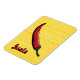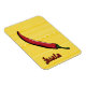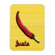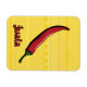 Un chile rojo jwala, también conocido como pimienta picante india, está decorado con patrones inspirados en el mehndi indio y se sienta en un fondo amarillo con una versión más pequeña del mismo patrón y una etiqueta de escritura en la esquina. Esta pimienta moderadamente picante se utiliza para darle calor a los currys auténticos y a la cocina india.
