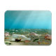 Un barco en una botella se hundió en las costas del océano, rodeado de conchas marinas e iluminado por rayos de luz solar.