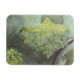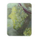 El cuadro representa un conjunto de uvas en tonos amarillos y verdes, colgadas de una vid. Las uvas aparecen en plumas y translúcidas, captando luz que realza su aspecto fresco y jugoso. Las hojas que rodean el racimo son un verde vibrante, con venas delicadas visibles, lo que añade profundidad a la escena. El fondo está ligeramente difuminado, lo que hace que la atención se centre en las uvas y le da a la imagen una sensación de calma y maduración, como si se tratara de un cálido día de finales de verano. Los colores son suaves, naturales y evocan una abundancia